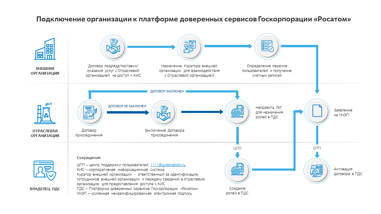 Внешние организации запрашивают доступ к КИС для исполнения своих обязательств по договорам с отраслевыми организациями. Для того, чтобы применять УНЭП Внешняя организация назначает ответственного сотрудника (куратора), который идентифицирует пользователей и направляет перечень пользователей в отраслевую организацию в рамках стандартного процесса получения учётных записей в домены INTER/GK Отраслевая организация в рамках договора присоединения направляет Листы исполнения для доступа к ПДС, а так же направляет заявление на предоставление услуги Платформы доверенных сервисов в отношении усиленных неквалифицированных сертификатов электронной подписи.
